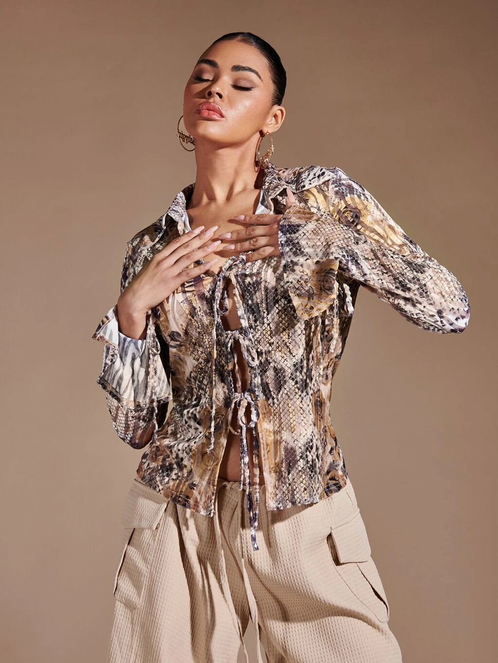 Floral & Snakeskin Print Tie Front Flounce Sleeve Tee