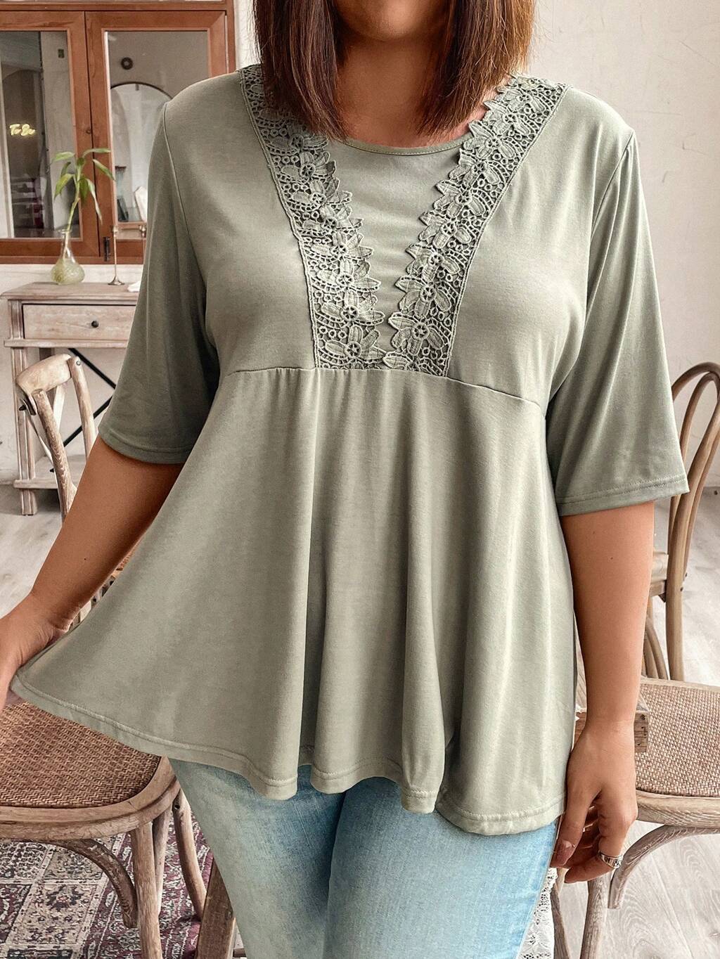Plus Size Lace Splice Round Neck Casual T-Shirt