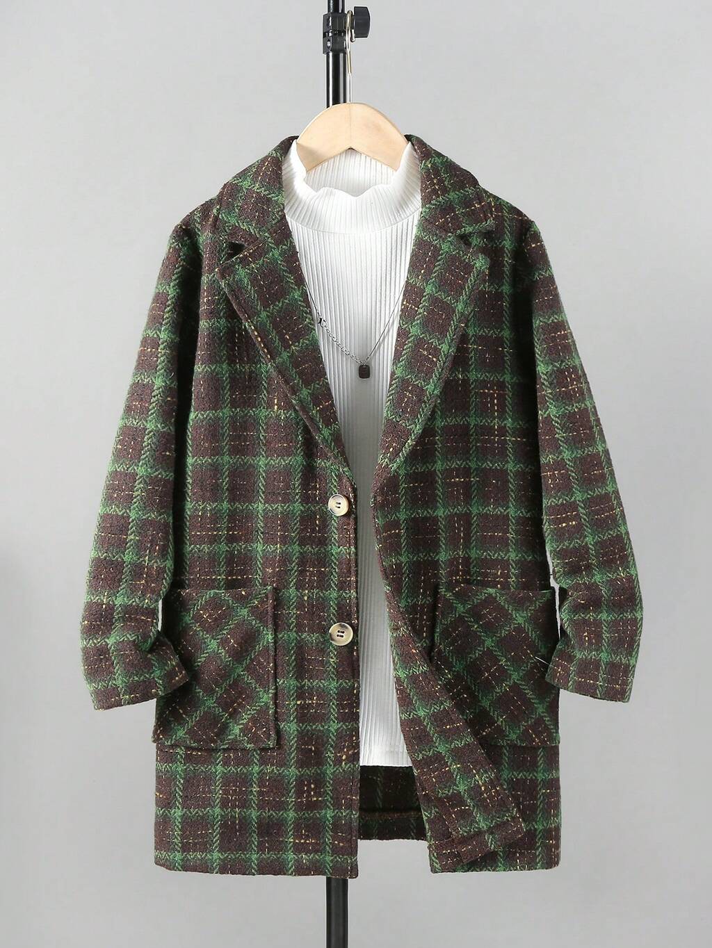 Tween Boy 1pc Plaid Lapel Collar Dual Pocket Overcoat