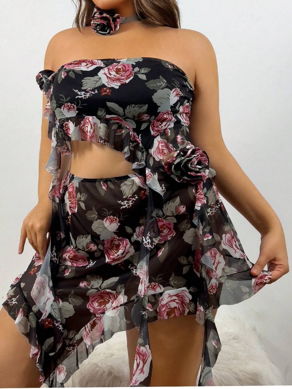 Plus Size Flower Pattern Printed Sexy Lingerie 4pcs/Set