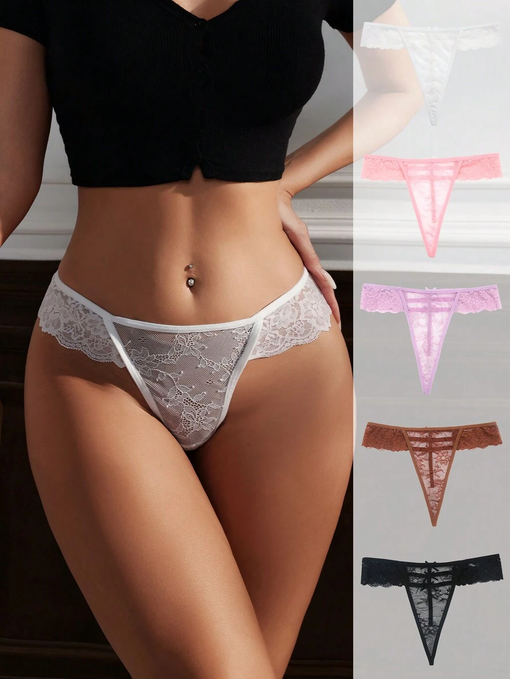 5pcs/Set Women's Solid Color Lace Trimmed Thongs