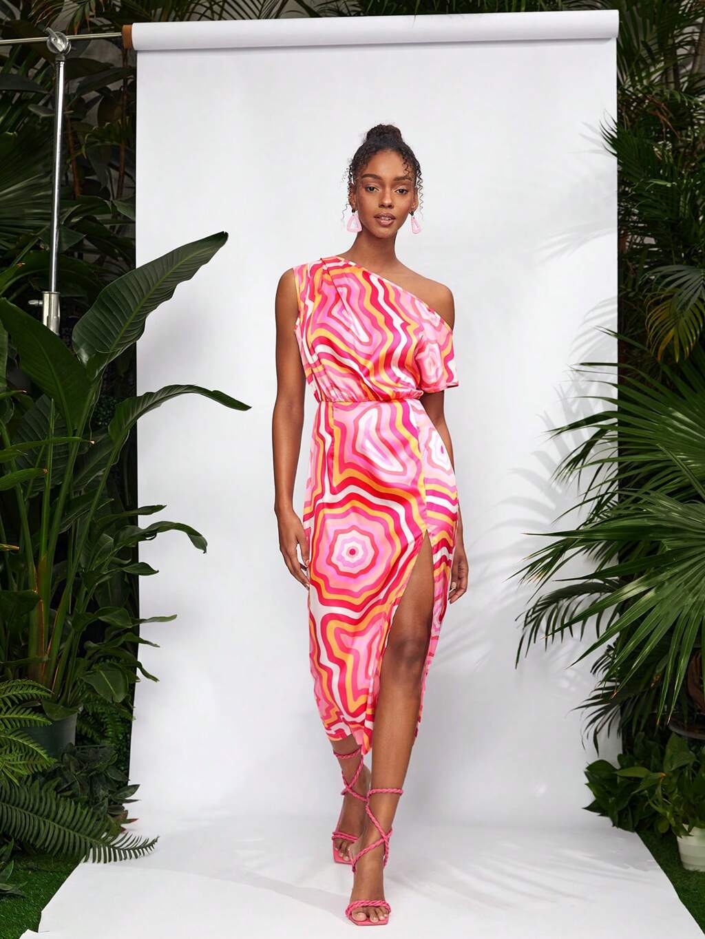 Designer Geode Overall Print Asymmetrical Neck Split Thigh Dress, Sundress Summer Elegant Dress Outfit, For Holiday, Party, Birthday Outfits, Festival, Wedding, Prom Dress