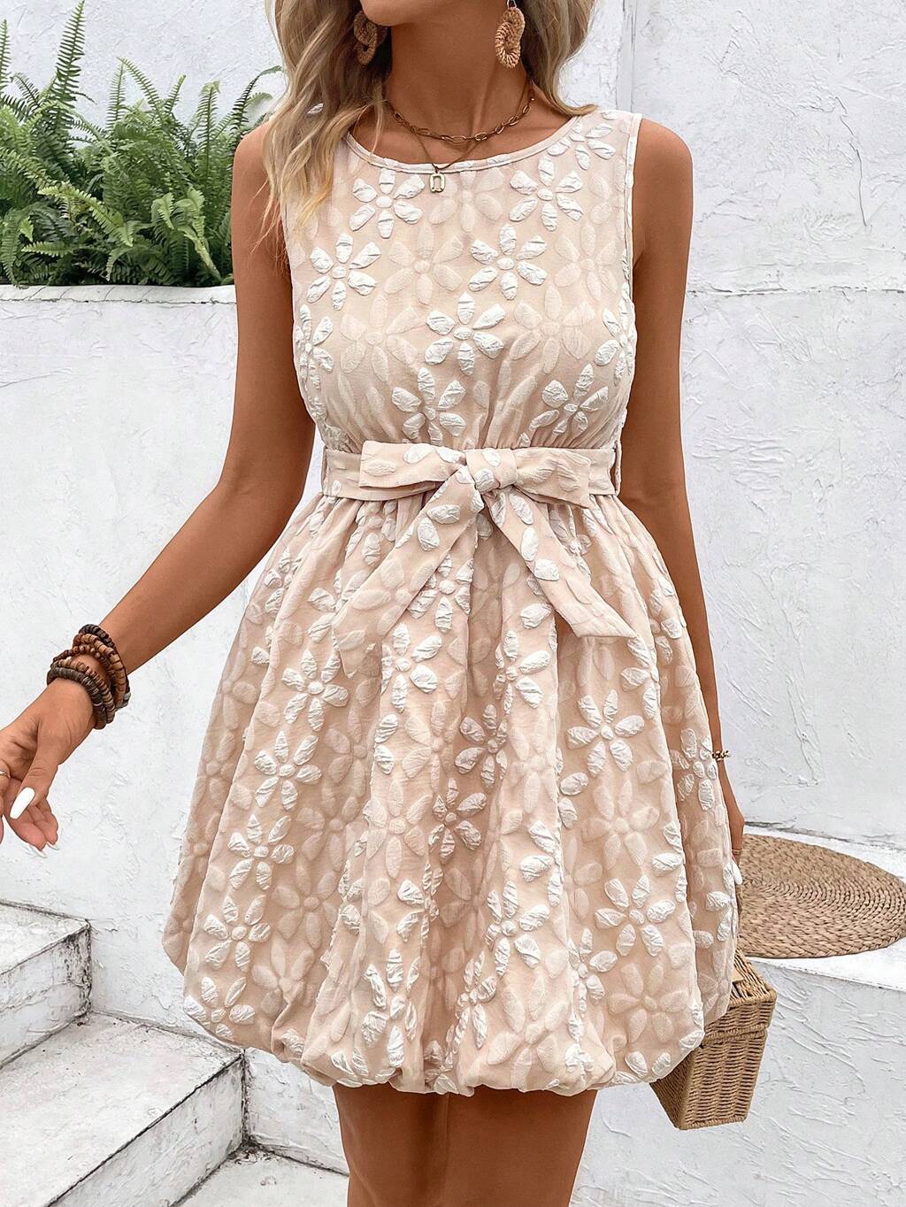 Round Neck Sleeveless Flounce Hem Textured Dress With Smocking Waistline