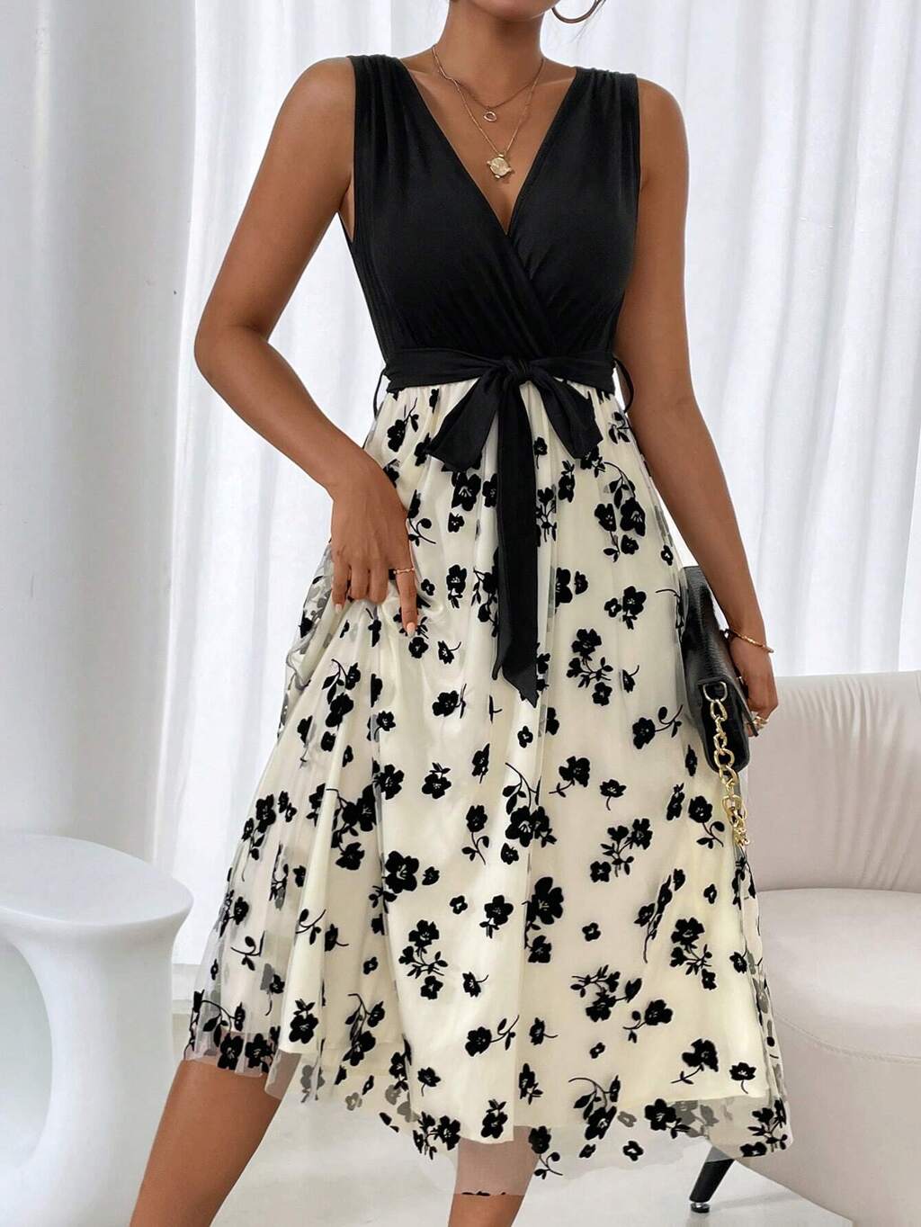 Ladies Splicing Flower Printed V-Neck Sleeveless Dress With Asymmetrical Hem, Perfect For Summer Casual Wear