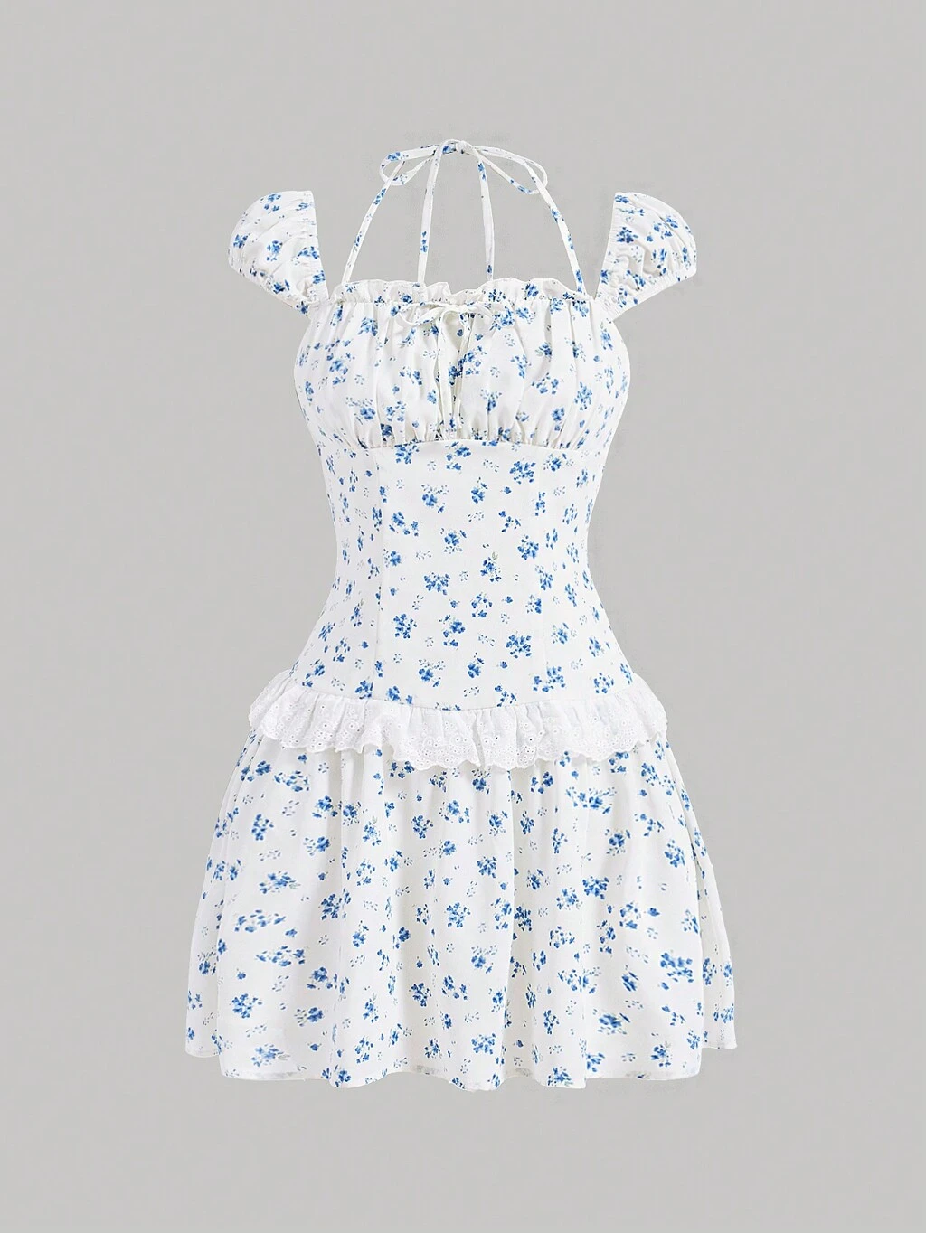 Women Summer Holiday Floral Print Babydoll Dress With Lace Trim, Petal Sleeves And Neck Tie