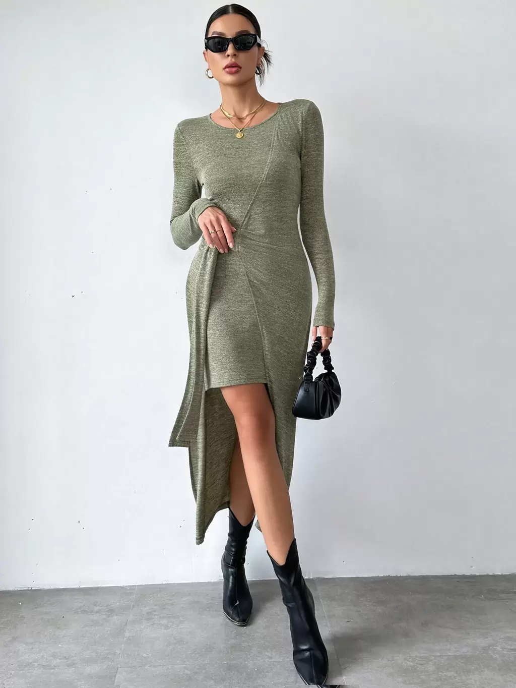 Asymmetrical Neckline Long Sleeve Dress