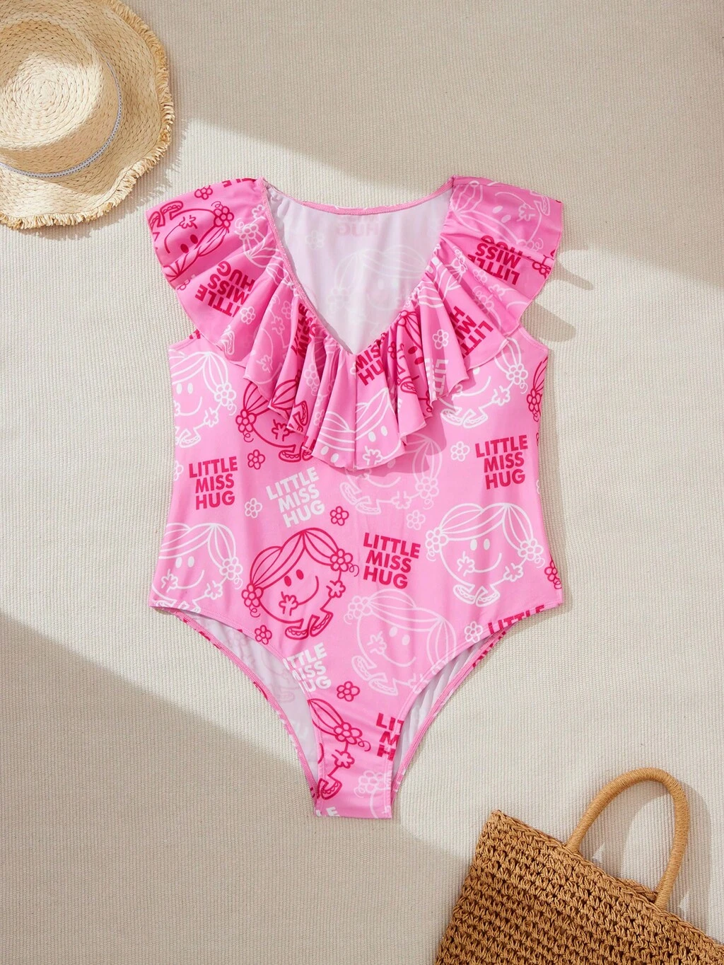 Plus Size V-Neck Ruffle Trim Cartoon And Letter Graphic One-Piece Swimsuit , Summer Beach