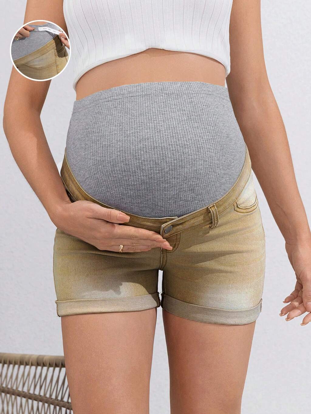 Maternity Denim Shorts, Casual Tight-Fit Elastic Knitted Fabric With Adjustable Waist