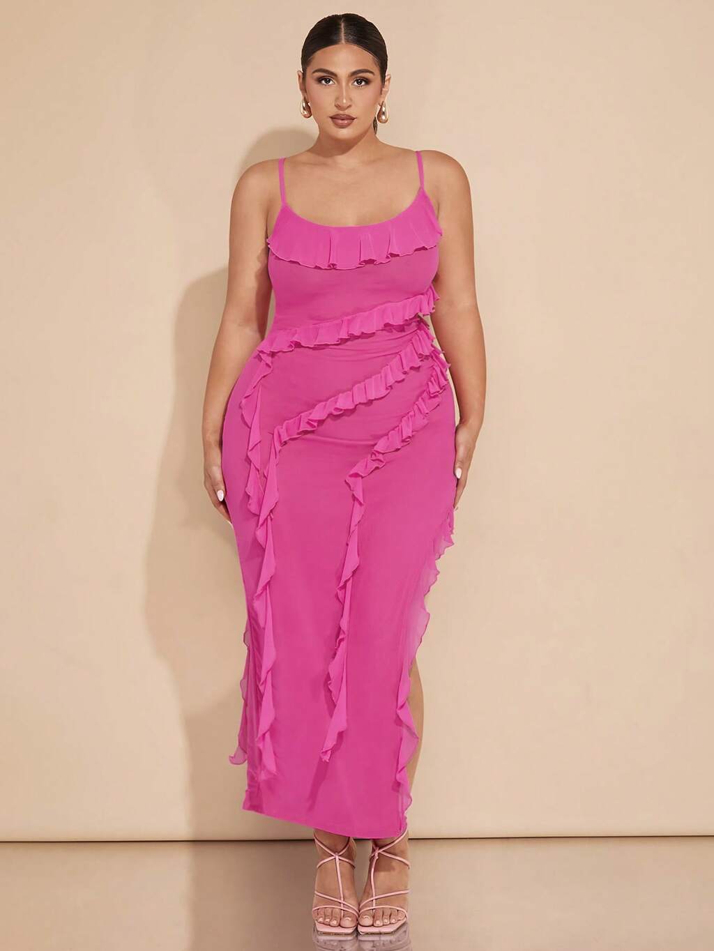 Plus Size Women's Solid Rose Red Summer Flowy Seaside Vacation Elegant Ruffled Stretch Mesh Suspender Long Dress