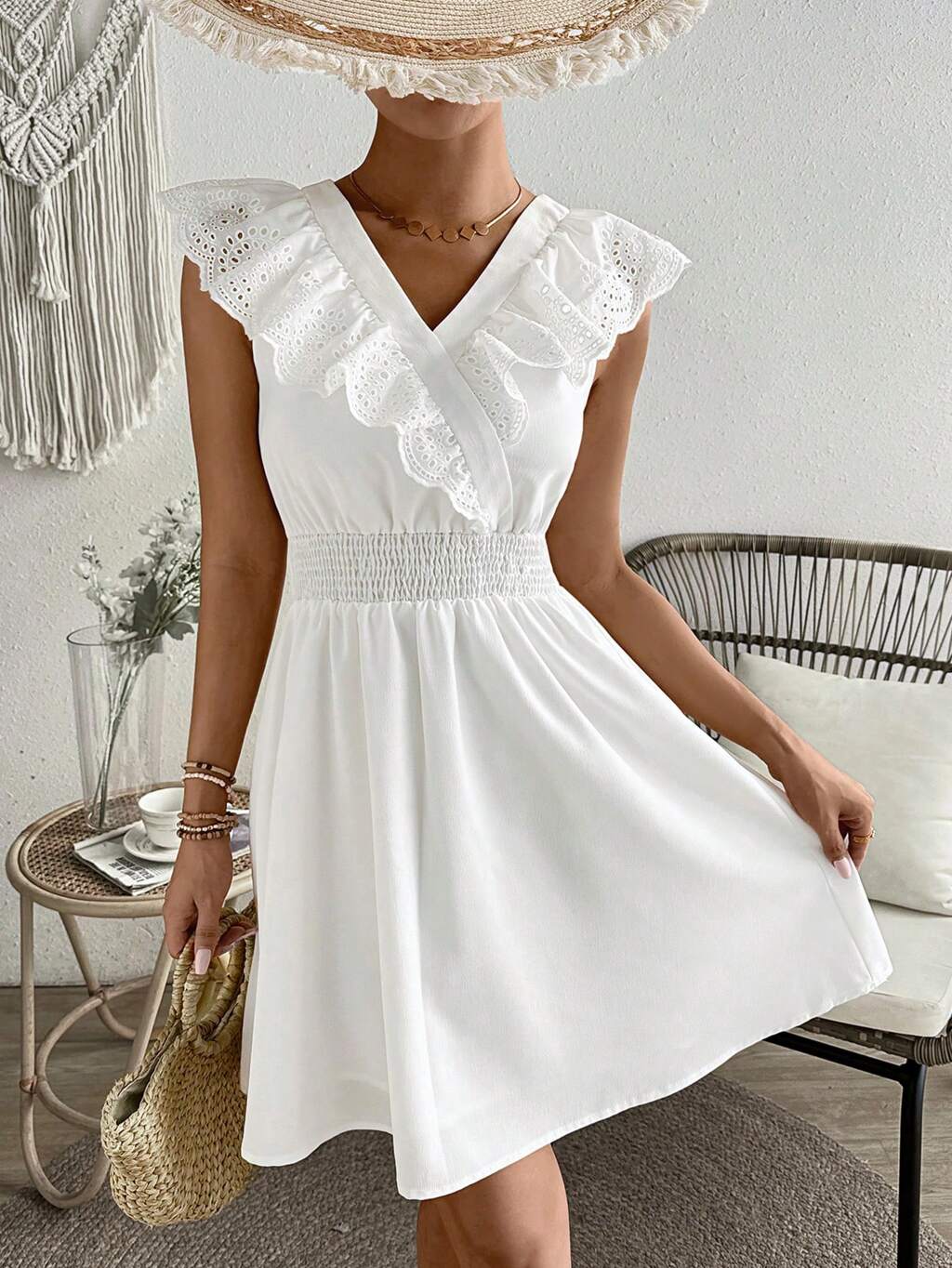 Embroidered Fabric 3D Ruffle Trim Splice, Waist Cinching Design, Textured Mini Vacation Style Dress