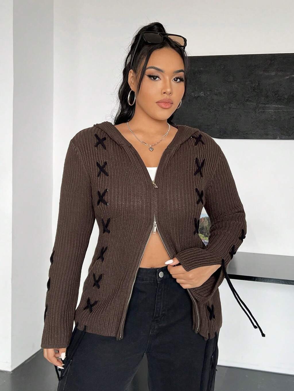 Plus Star Pattern Drop Shoulder Zip Up Drawstring Hooded Cardigan & Knit Skirt