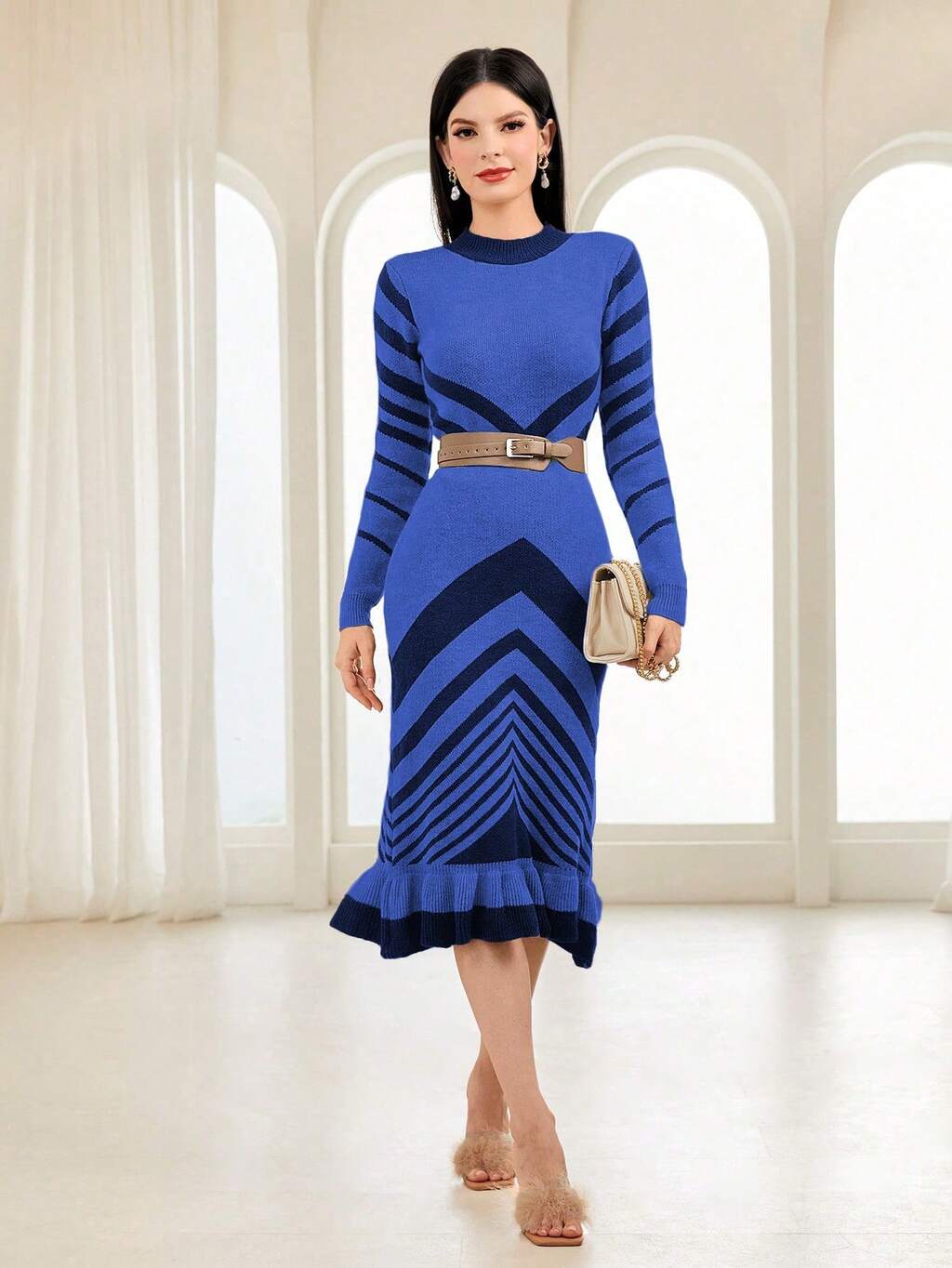 Sweater Gradient Striped Tight-Fitting Long Dress In Brown, Sexy