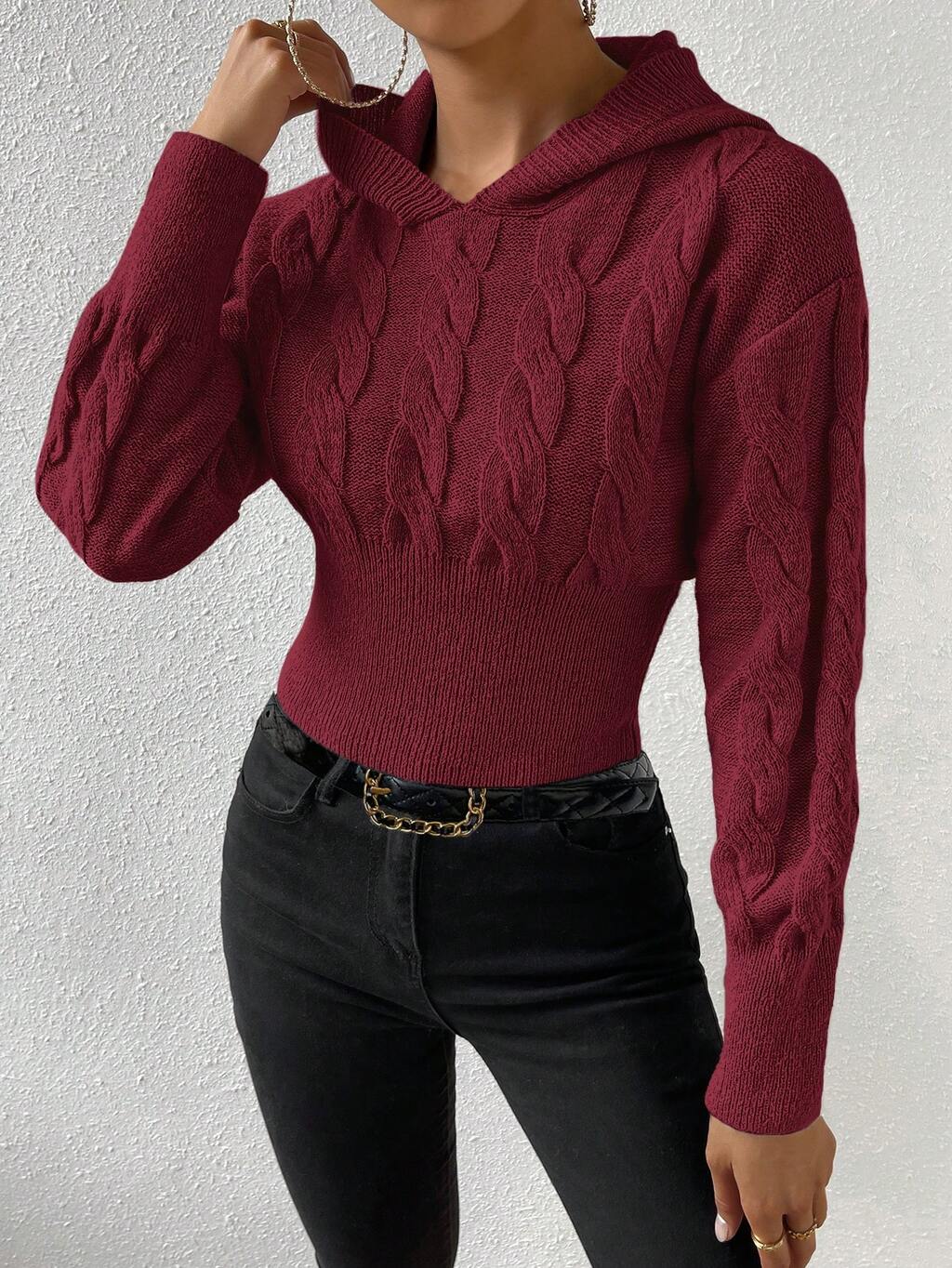 Cable Knit Drop Shoulder Hooded Sweater For New Year Knit Pullover Fall Winter Sweater