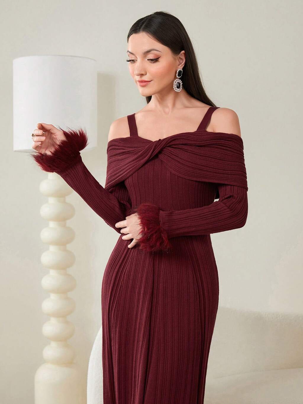 Cold Shoulder Twist Front Fuzzy Cuff Sweater Dress Without Belt