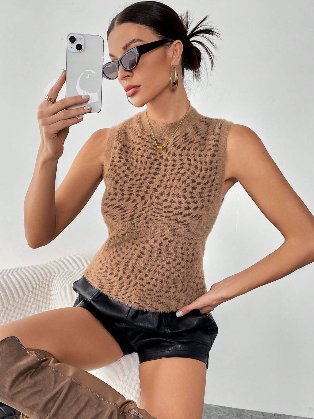 Leopard Pattern Drop Shoulder Cable Knit Cardigan
