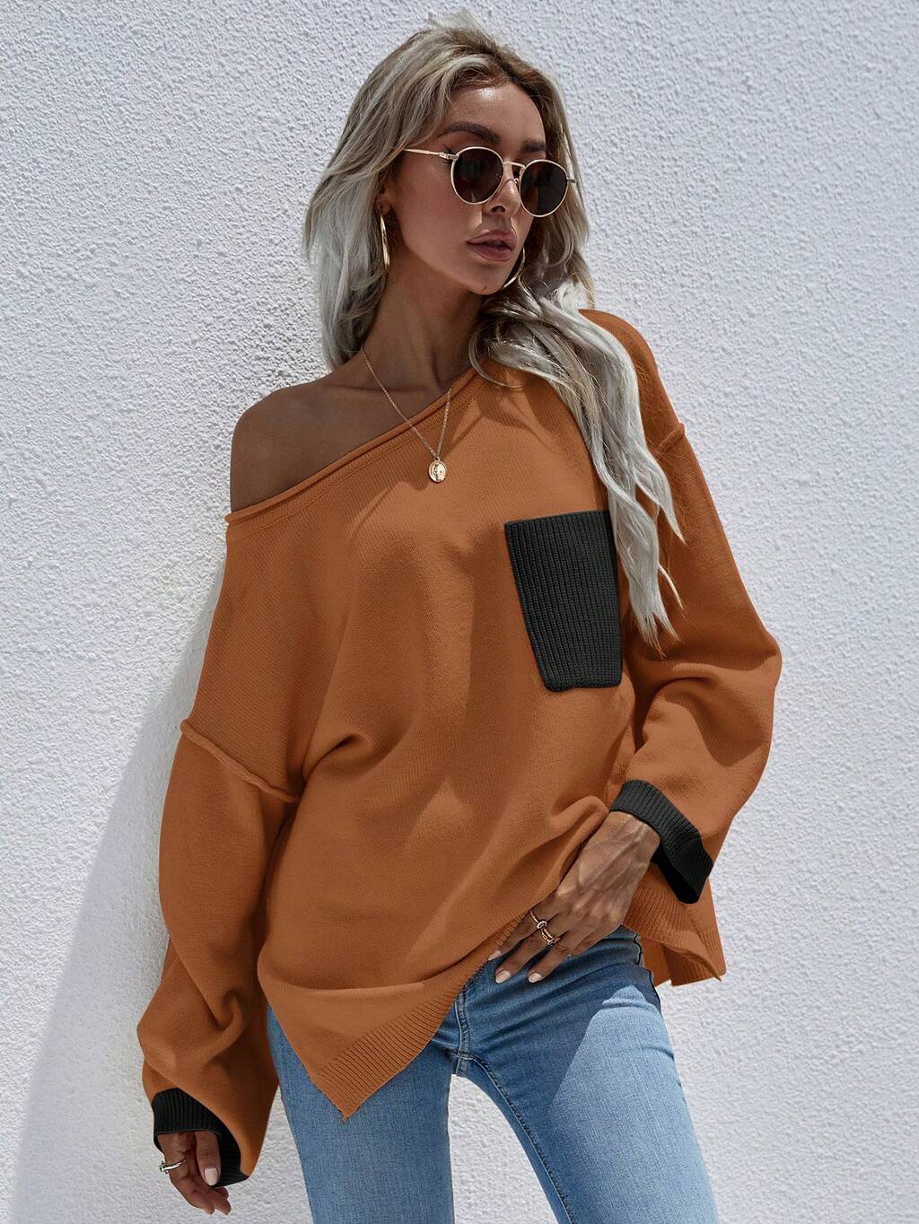 Contrast Panel Pocket Patched Split Hem Drop Shoulder Knit Pullover Fall Winter Sweater