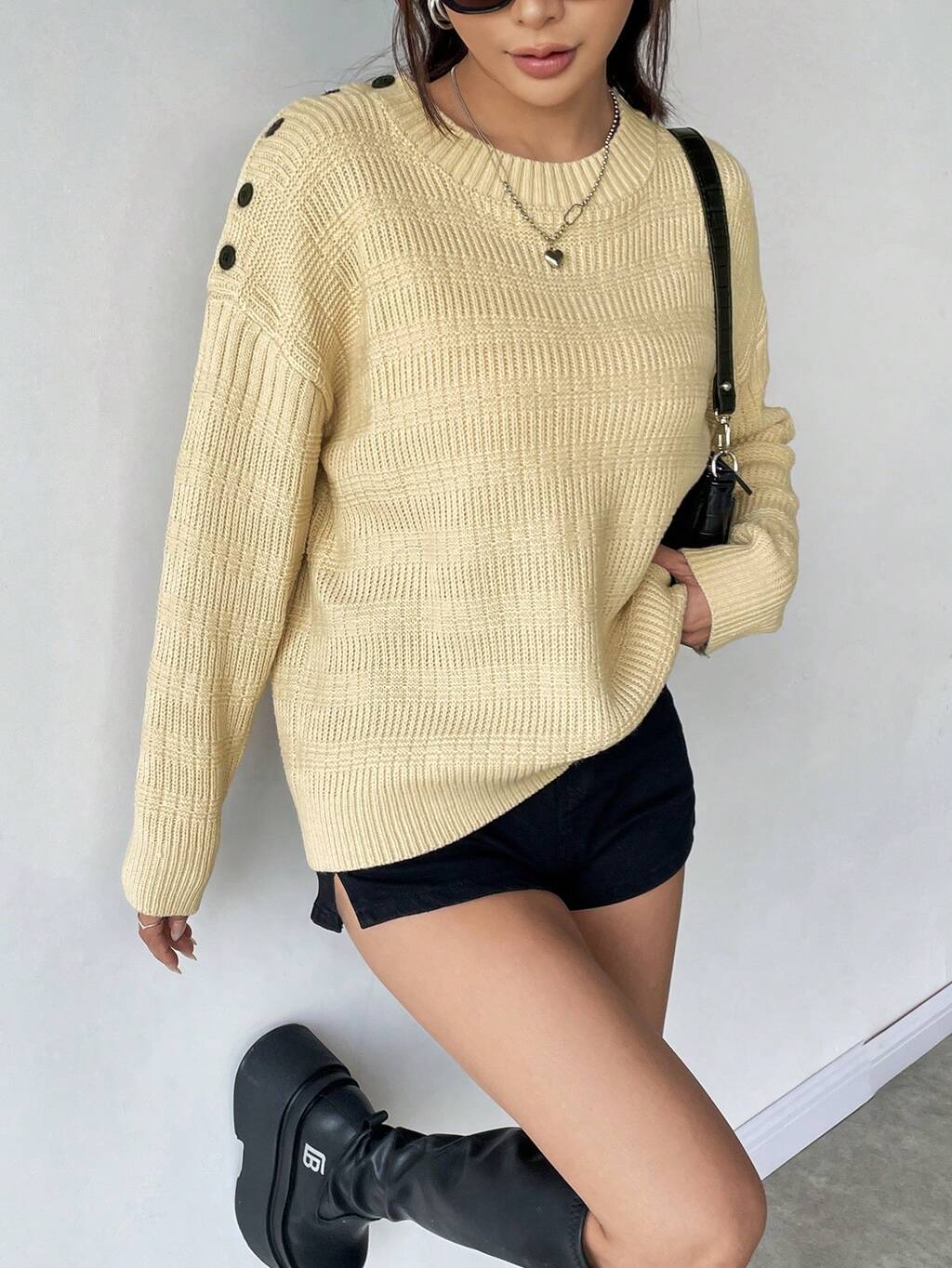 Button Detail Drop Shoulder Knit Pullover Fall Winter Sweater
