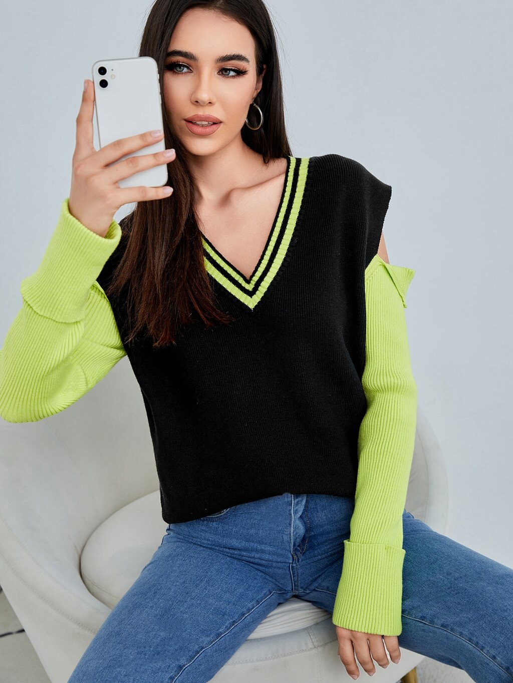 Contrast Panel Split Sleeve Asymmetrical Neck Sweater Knit Pullover Fall Winter