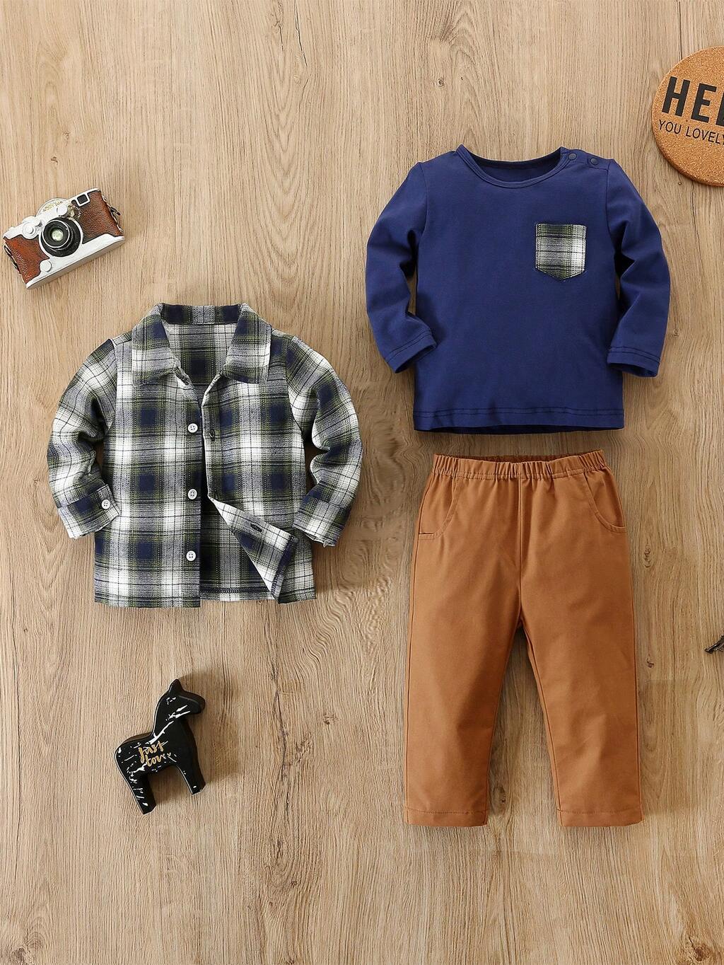 3pcs Baby Girls' Casual Long Sleeve T-shirt, Checkered Shirt, Pocket Pants Outfits