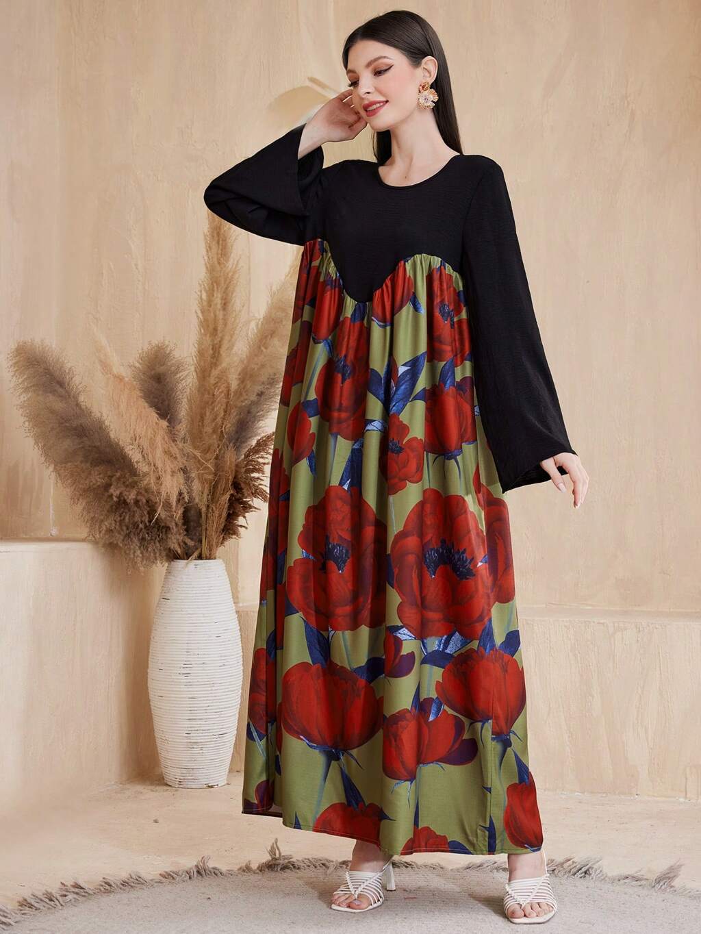 Patchwork Floral Print Loose Fit Round Neck Dress