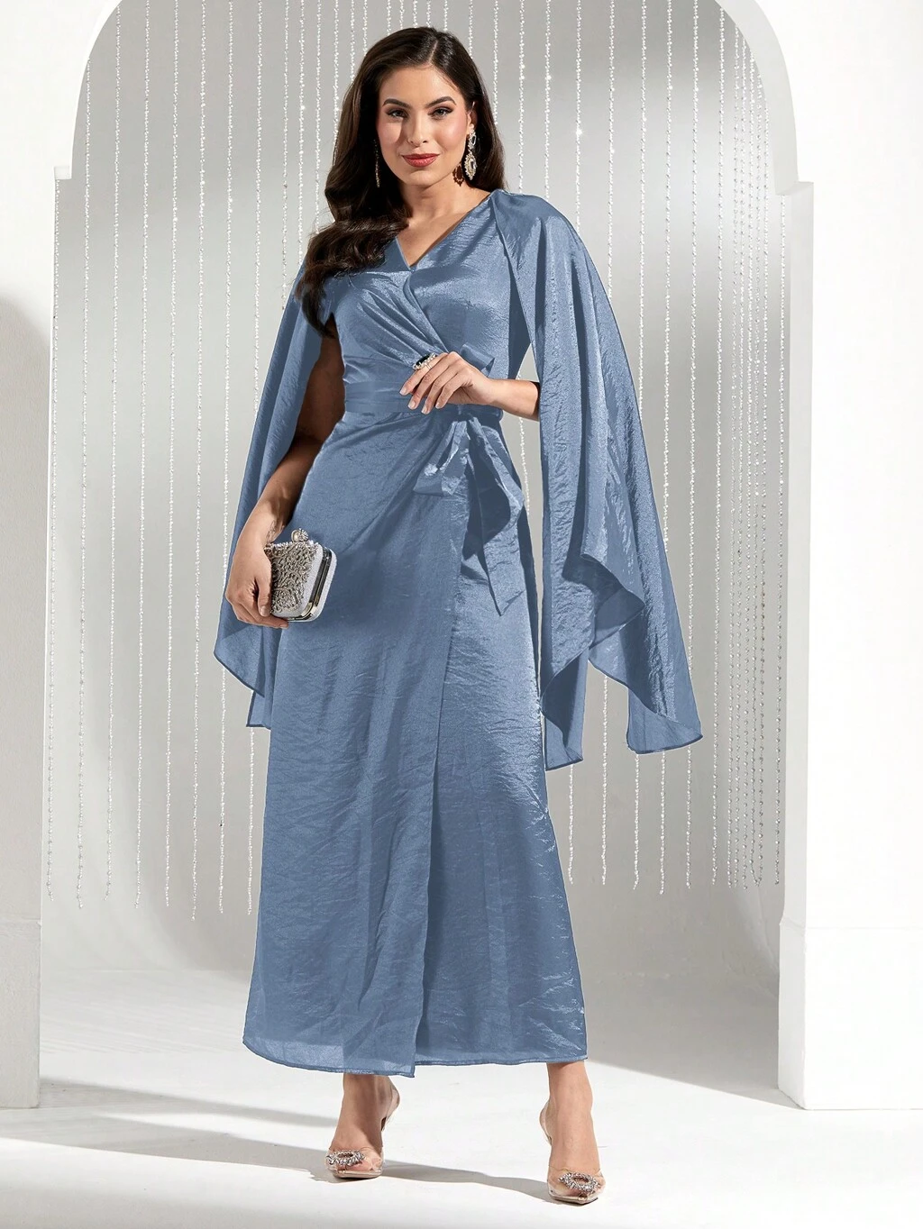 Women's Spring/Summer Solid Color Cape Sleeve Long Elegant Dress With Side Waist Knot Long Evening Dresses
