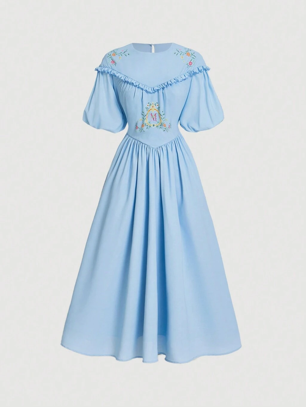 Summer Long Blue Dress With Vintage Print And Frill Hem, Short Sleeves