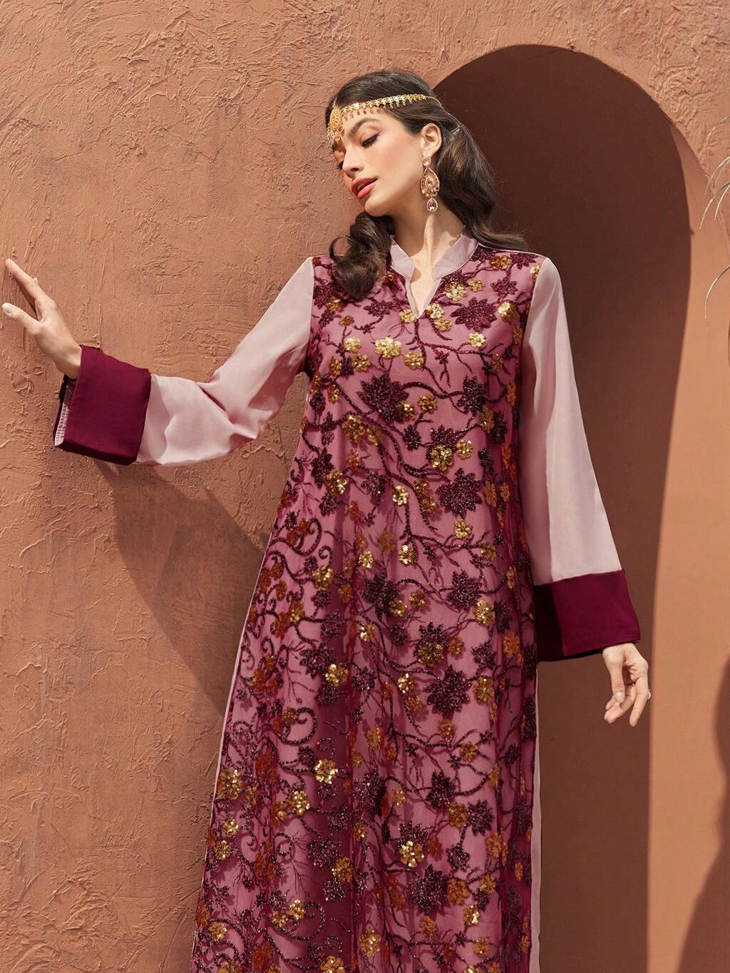 Women's Loose Fit Color Block Sequin Embroidery Patchwork Dress, Elegant Evening Party Dress Kaftan Jalabiya Dress