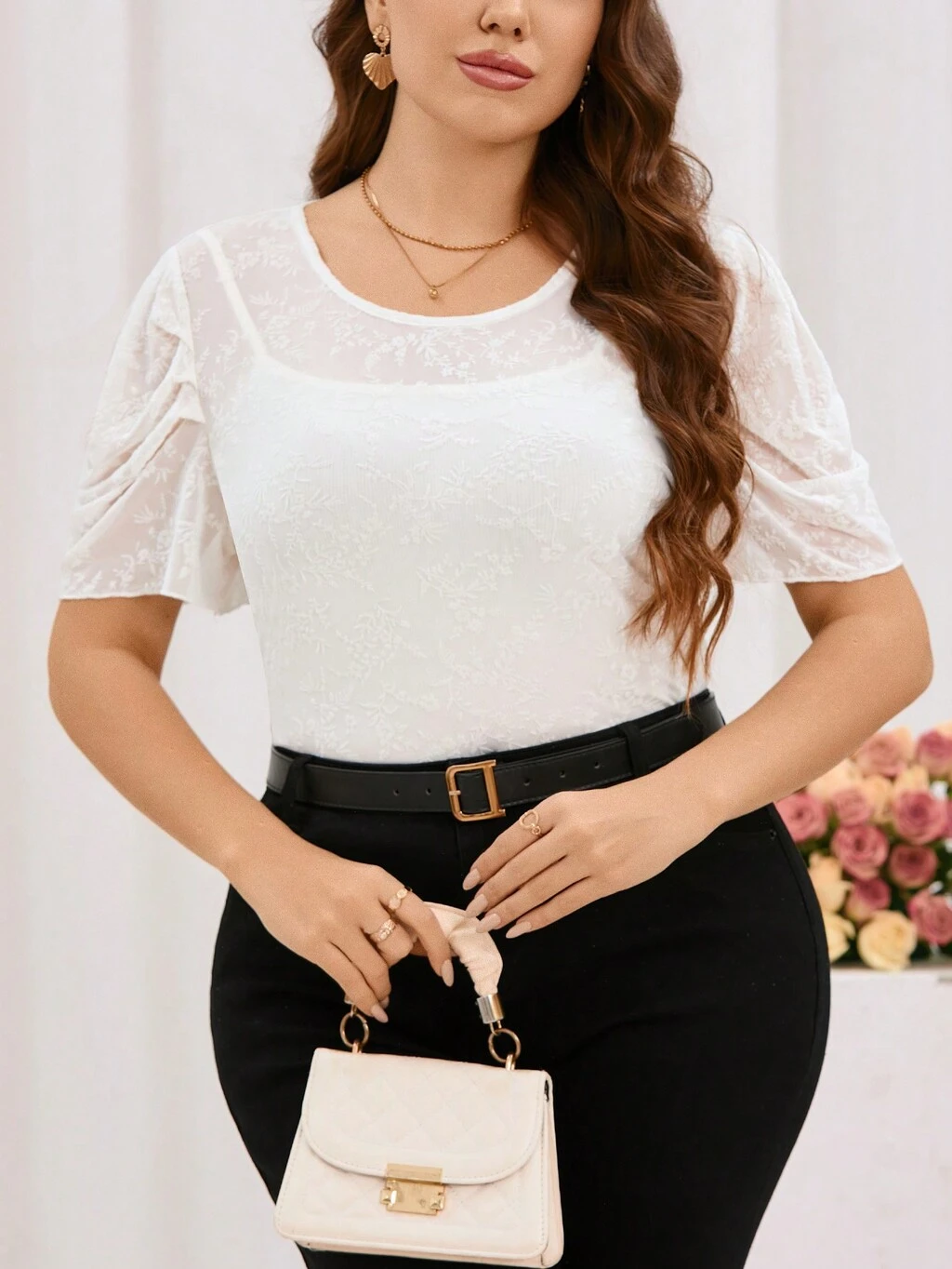 Plus Size Women's Knitted Jacquard Hollow Out Flower Pattern V-Neck Top With Flutter Sleeves And Cinching Waist For Vacation, Casual And Dating