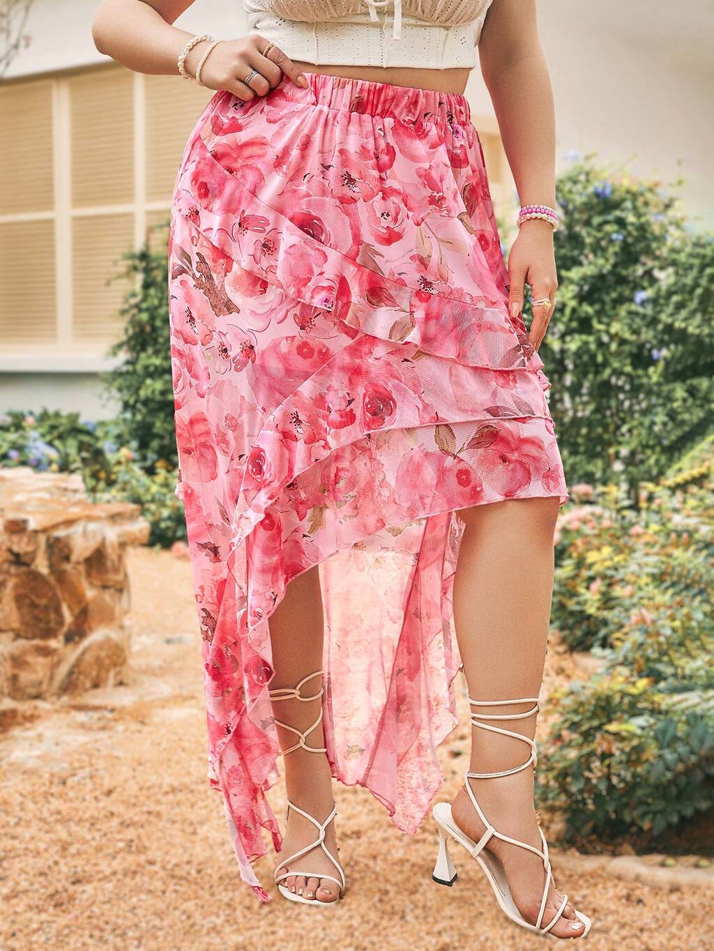 Women's Plus Size Casual Vacation Skirt With Ruffle Hem And Floral Print