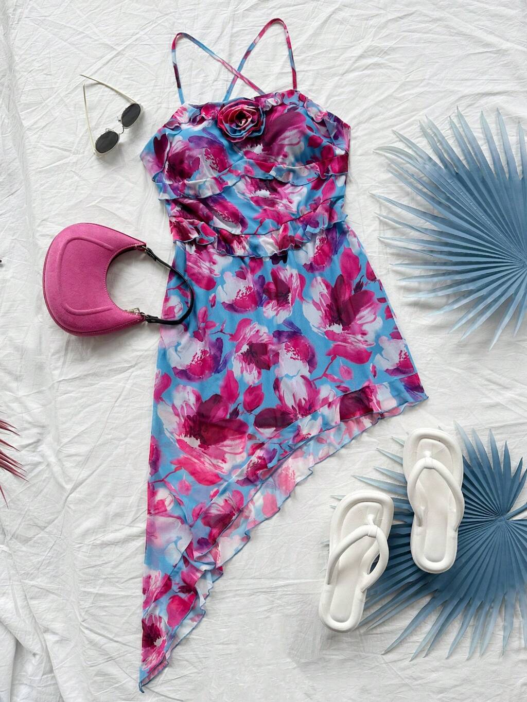Plus Size Women's Casual Floral Printed Spaghetti Strap Asymmetrical Ruffle Hem Dress For Vacation