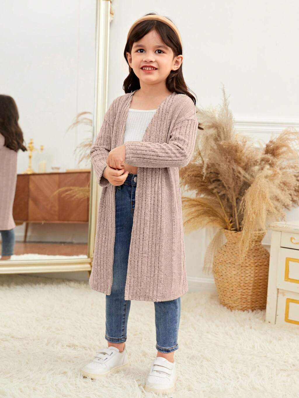 Young Girl Open Front Ribbed Knit Coat,In Fall/Winter