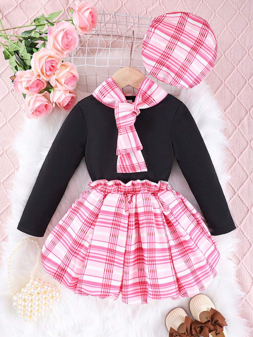 Young Girl Plaid Print Cami Top & Fuzzy Cuff Tee & Flare Skirt