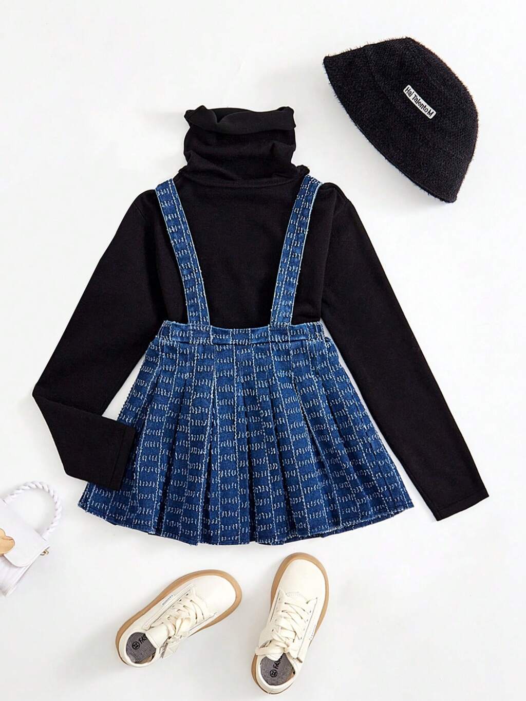 Young Girl Mock Neck Tee & Plaid Print Suspender Pants & Hat