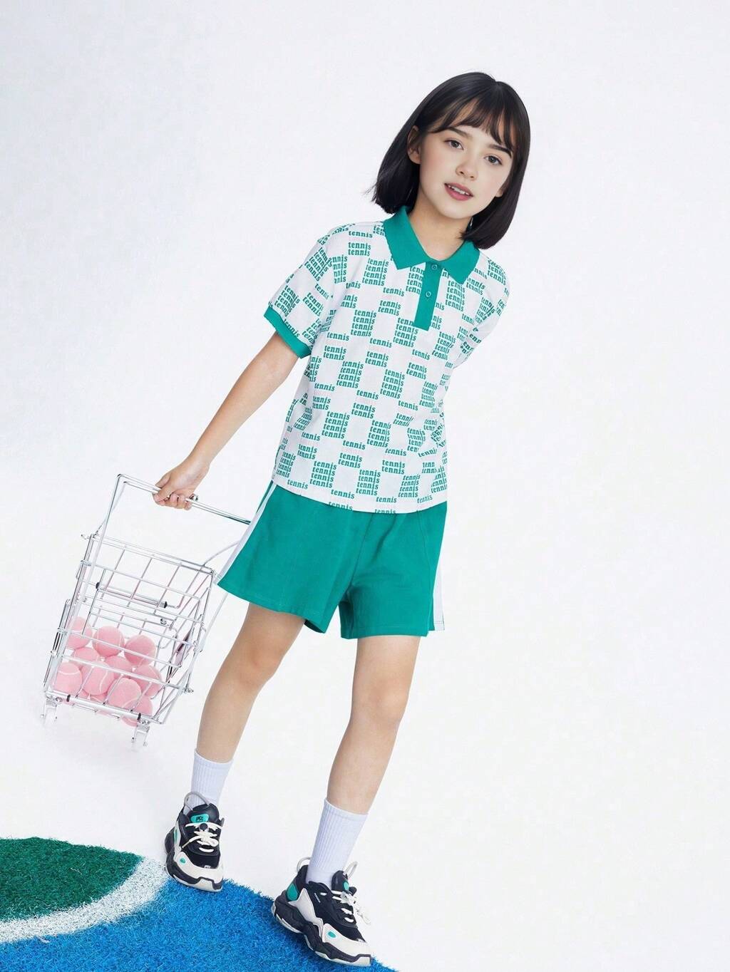 Annil Tween Girl Tops Polo Knitted Logo Printed Sports Breathable Turn-Down Collar Short Sleeve T-Shirts Green