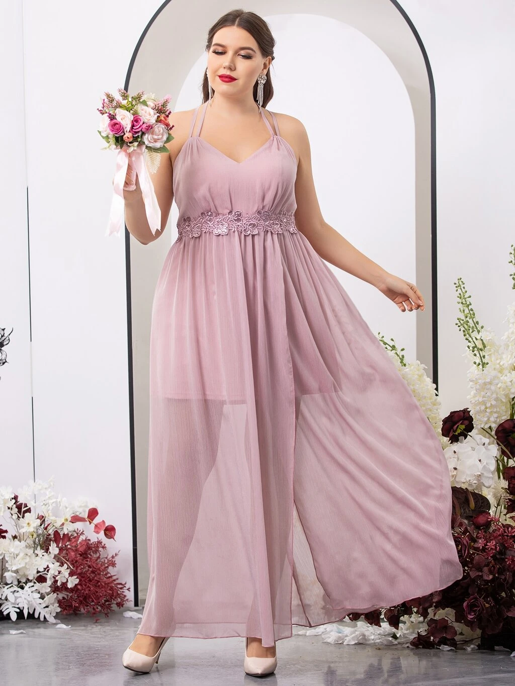 Plus Sequin Embroidered Applique Crisscross Halter Neck Chiffon Bridesmaid Dress