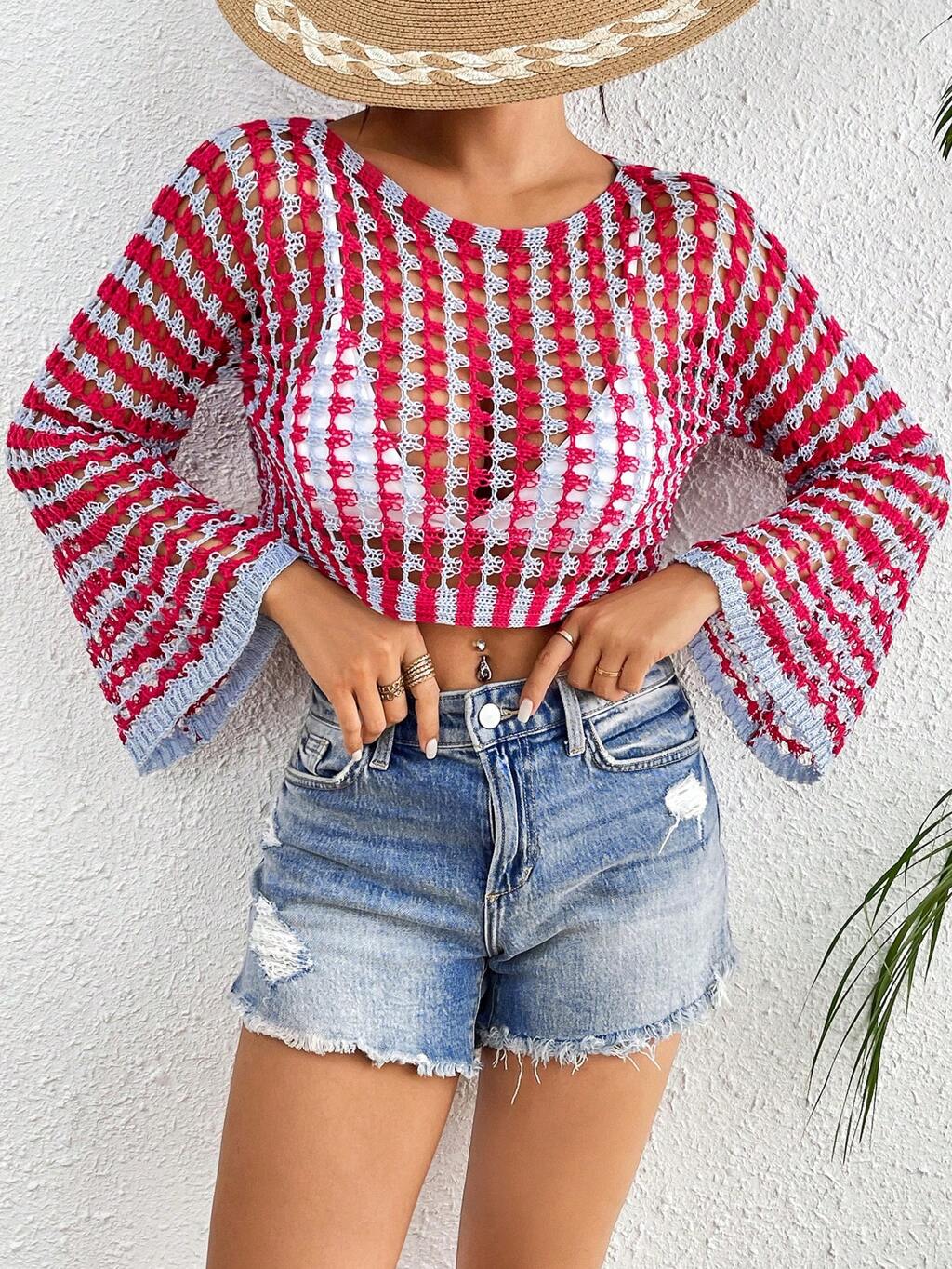 Summer Women's Round Neck See-Through Color Block Long Sleeve Cover-Up Top