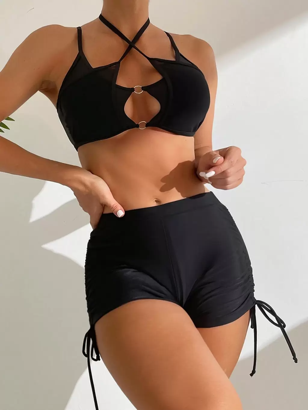 3pcs/Set Women's Solid Color Bikini Set With Ruched Detail Summer