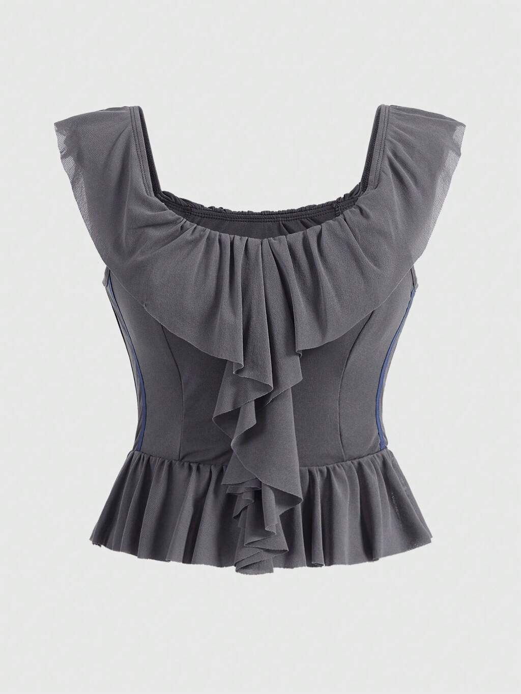 Fashionable Mesh Floral Top With Contrast Woven Belt And Ruffled Collar