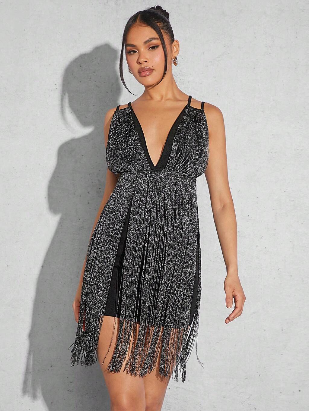 Women Deep V-Neck Fringe Fashion Party Dress With Double Shoulder Straps