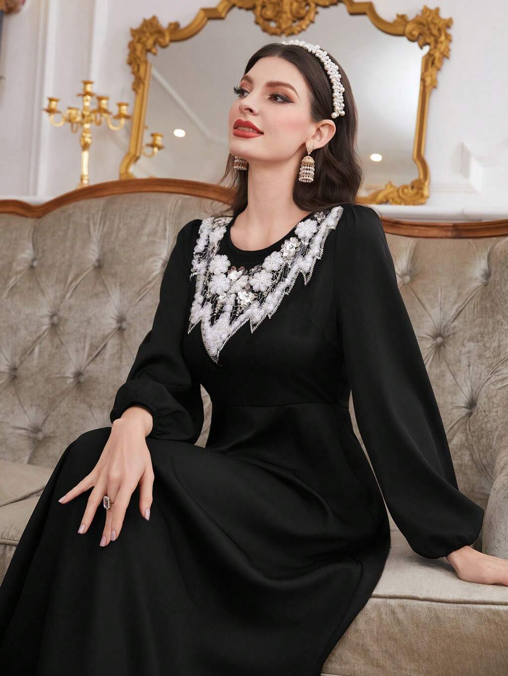 Women's Beaded Embroidered Lantern Sleeve Dress Long Evening Dresses Fall Cloth For Women