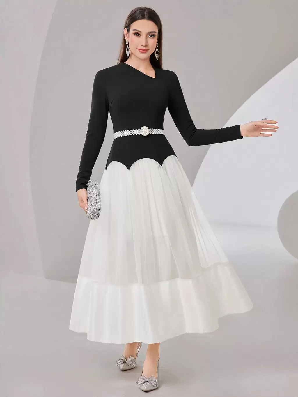 Women'S Long Sleeve Color Block Dress (Without Waist Chain) Long Evening Dresses
