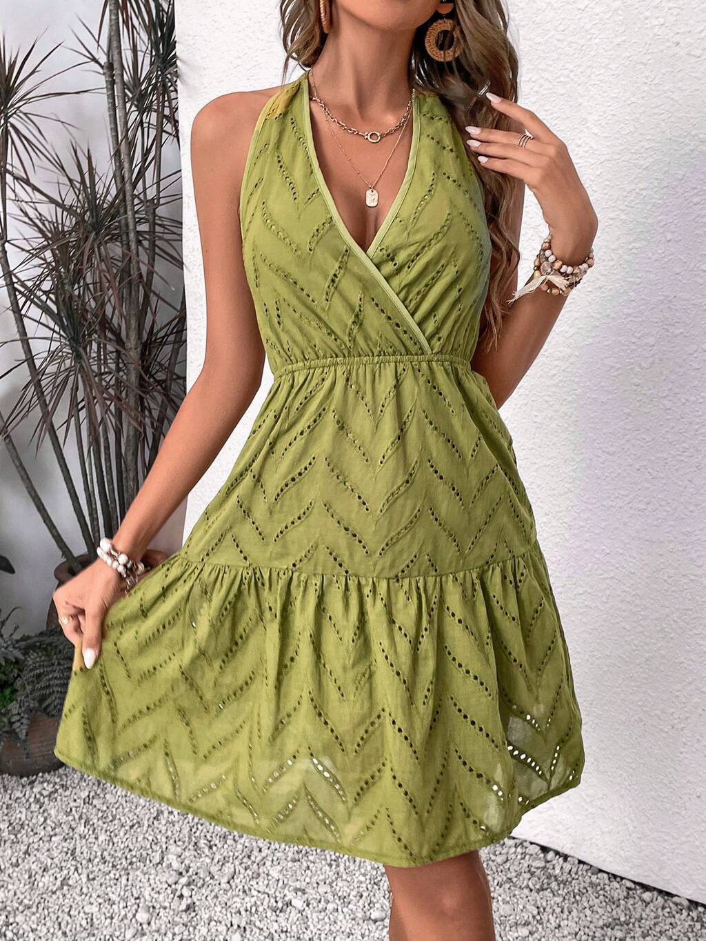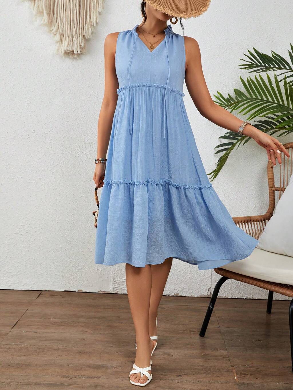 Women's Halter Neck Tie Back Sleeveless Dress With Ruffle Hem
