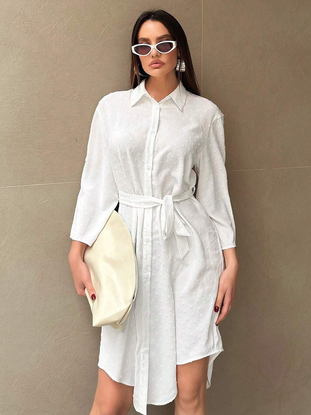 White Jacquard Texture Open Front Shirt Collar Casual Vacation Dress With Waist Tie And Sleeve Detail For Women