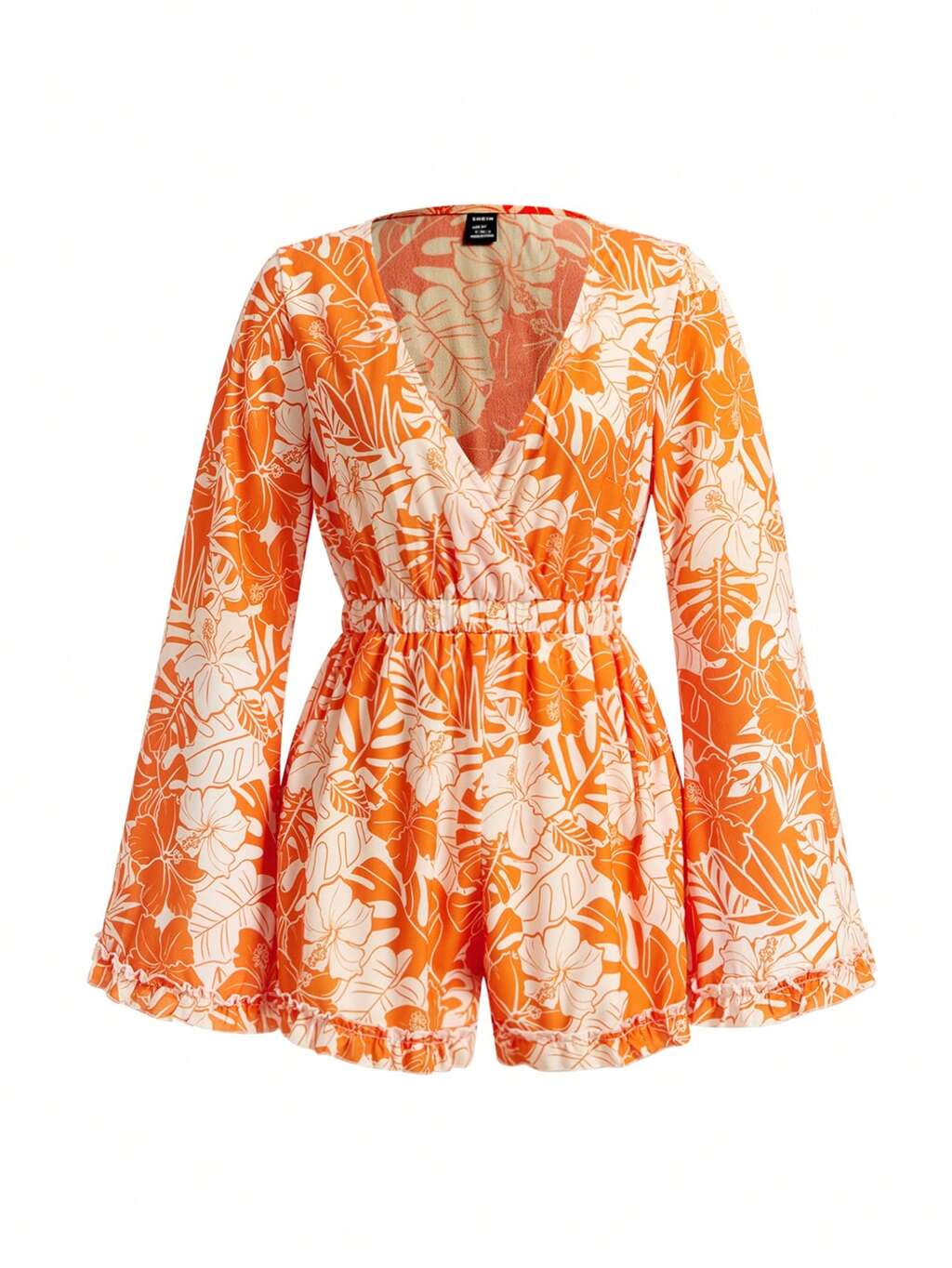 Women's Tropical Print Beach Vacation Short Sleeve Jumpsuit With Flared Sleeves And Elastic Waist