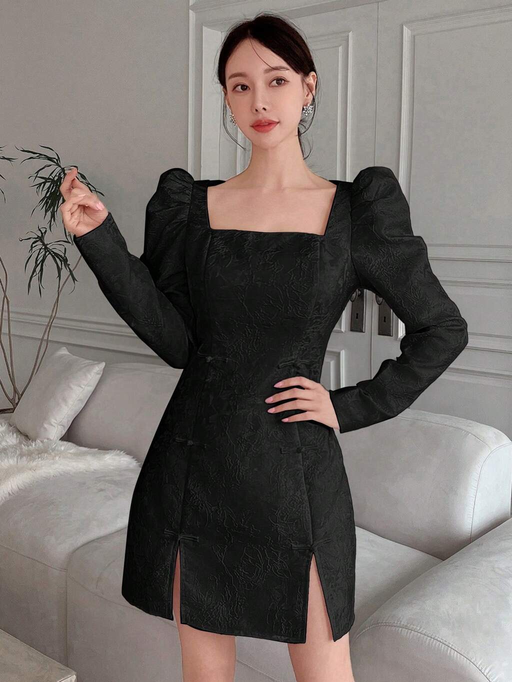 Women's Chinese Style Split Neckline Dress With Gigot Sleeve And Side Slits