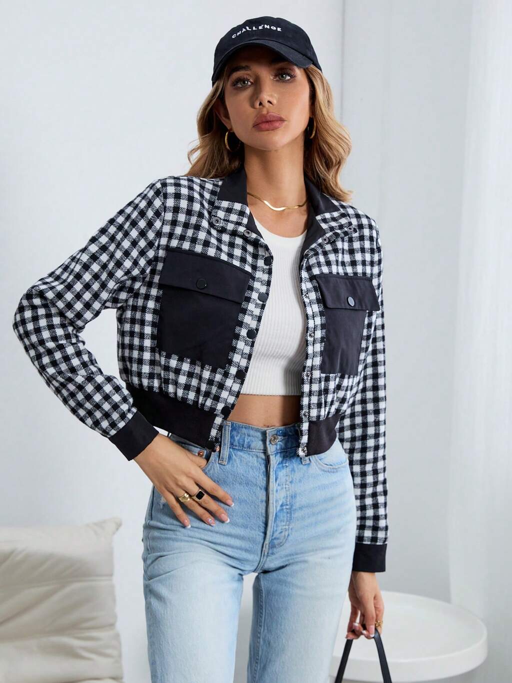 Houndstooth Print Flap Detail Tweed Jacket Fall Cloth For Women