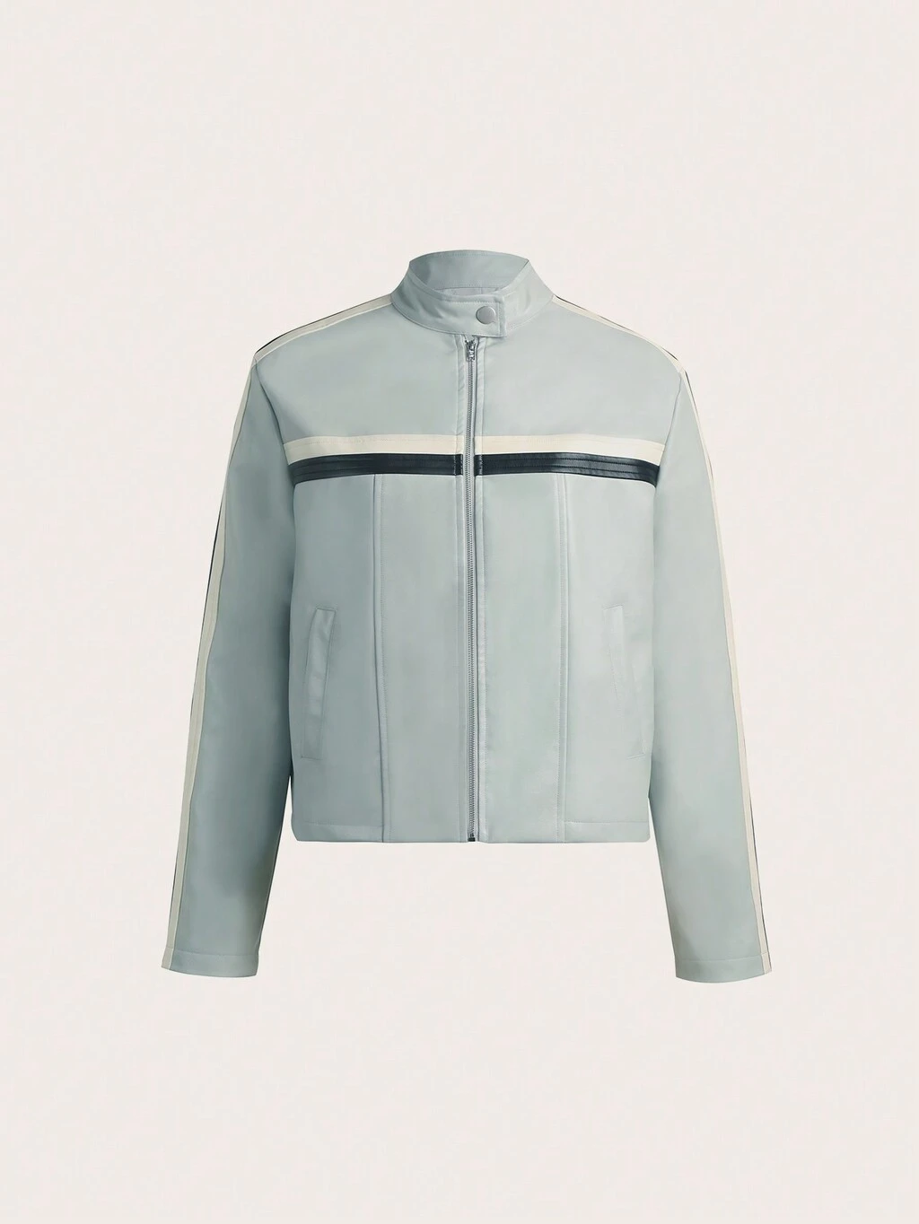 Contrast Trim Drop Shoulder PU Leather Bomber Jacket