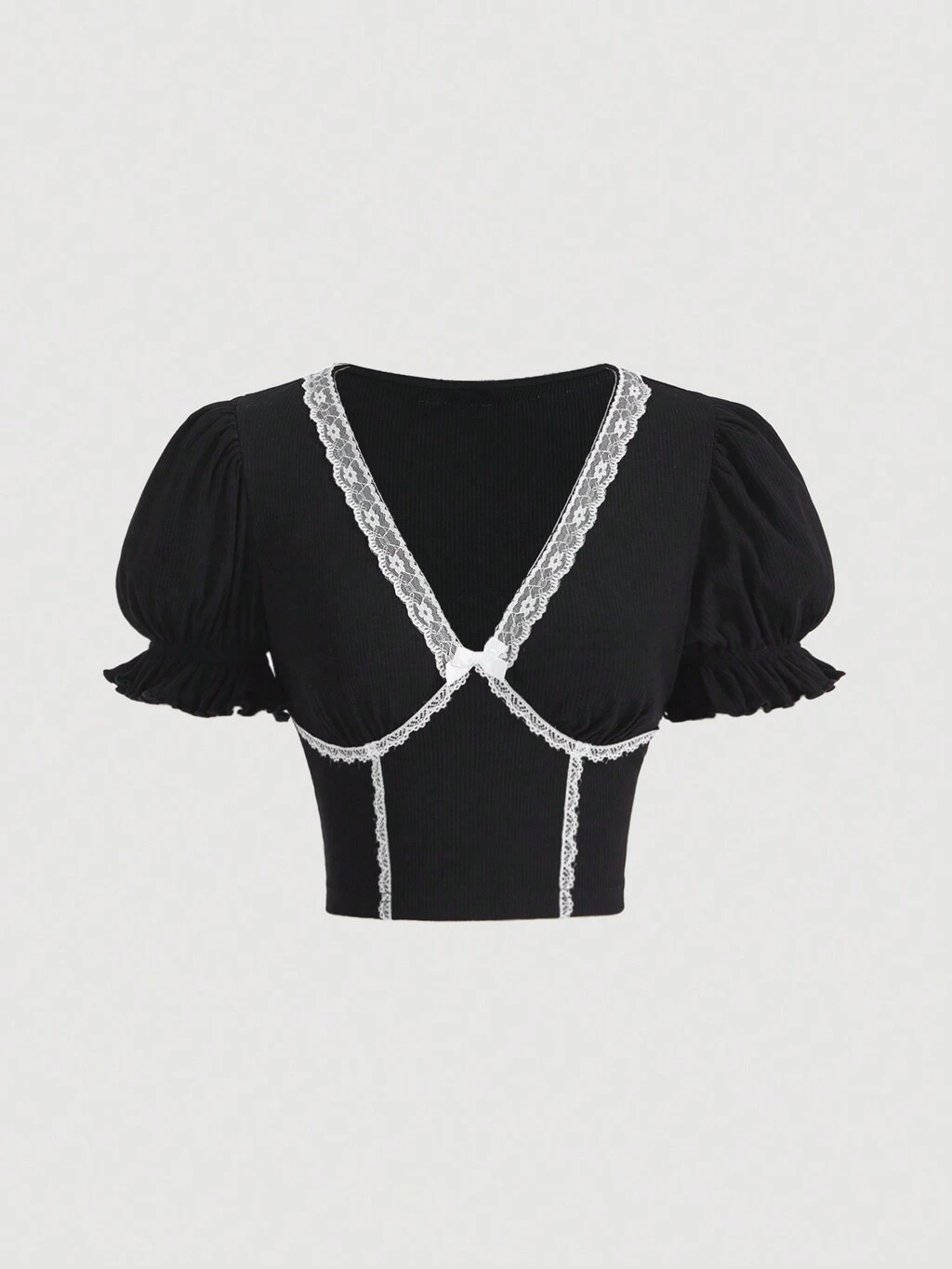 Ladies' Contrast Color Lace Trim Puff Sleeve T-Shirt