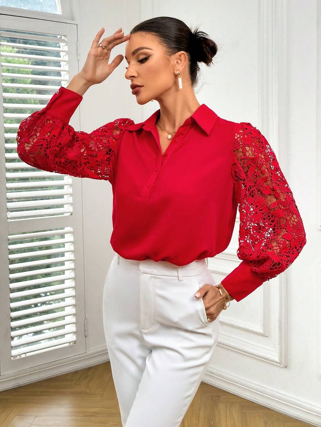 Ladies' Lace Trim Button Up Shirt Winter Casual