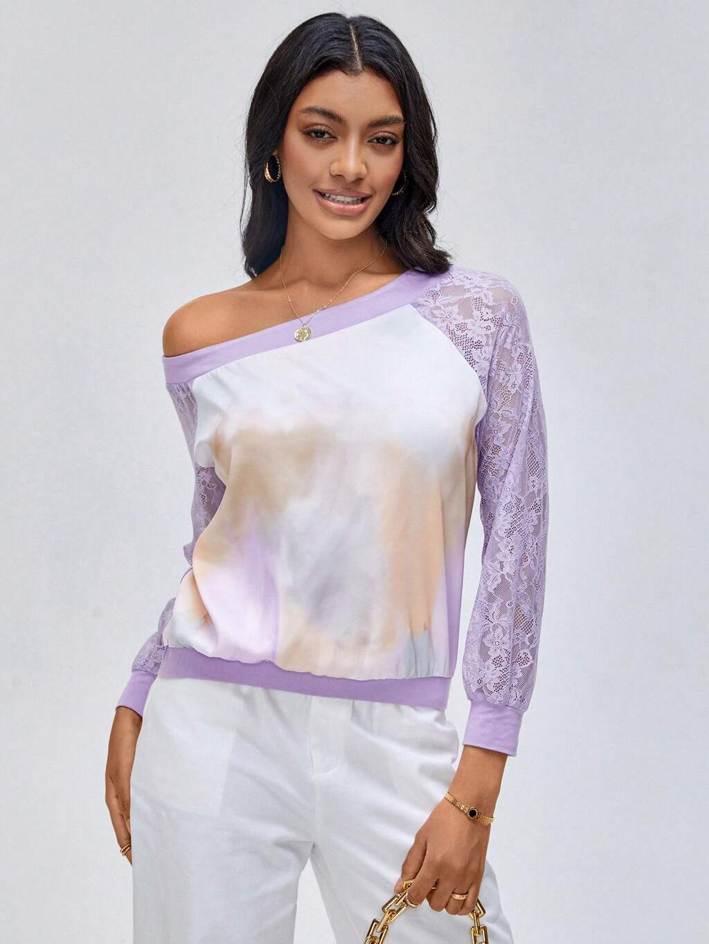 Designer Tie Dye Contrast Lace Raglan Sleeve Top, For Holiday, Vacation, Spring, Going Out, Festival, Ibiza Fits
